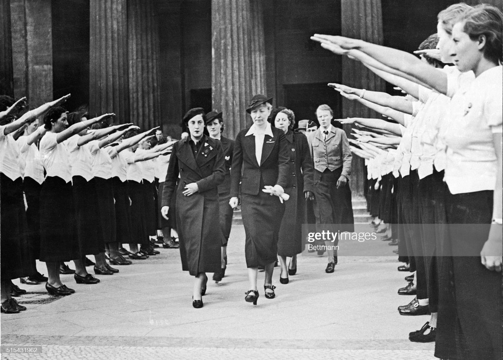 Led by Pilar Primo de Rivera (center left), a group of Spanish women Falangist leaders, representing the Nationalists, were welcomed in Berlin by members of the Nazi Women’s Workers’ Division.