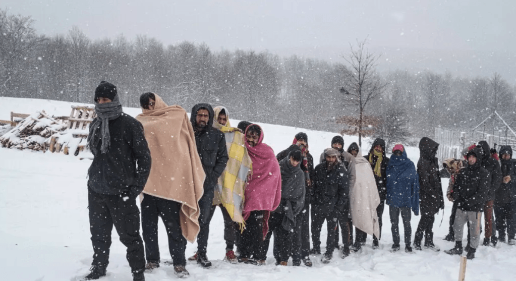 This image was taken by Marko Djurica and it is described as a line of migrants waiting in line for food in the northwestern region of Bosnia and Herzegovina.